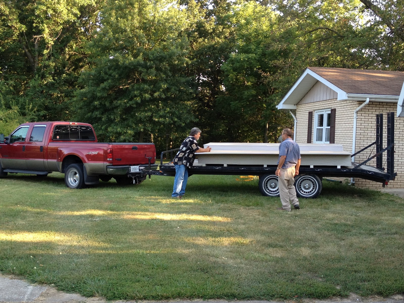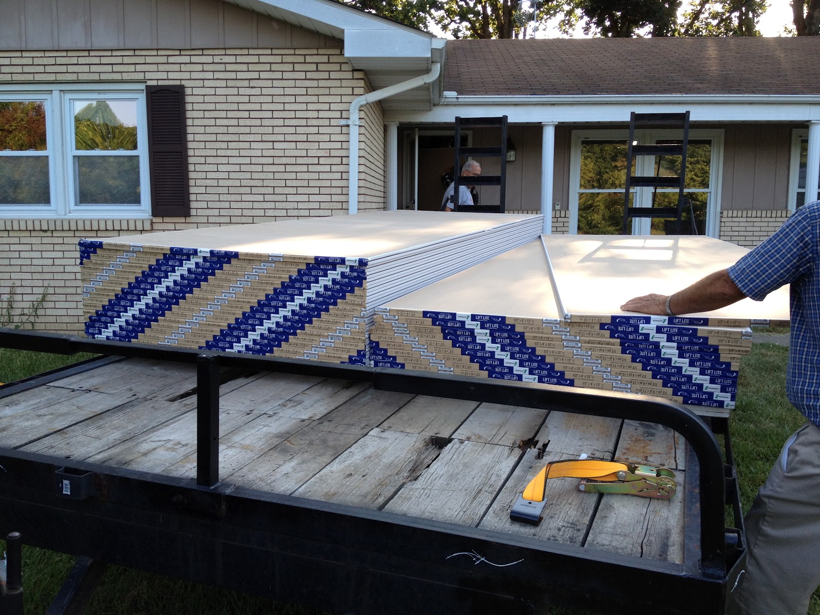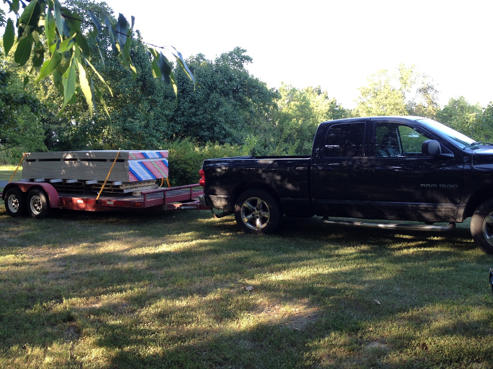 The day has finally come! We went to get the drywall late this afternoon so that we’d be ready for the drywall hanging guys tomorrow….I can’t wait to see what a difference it makes to have the drywall up! I couldn’t believe how HEAVY the loads of drywall were. We DID get the help of the Harmans again…Mike & Johnny went with us to pick it up…this way we had 2 trailers to bring it back with…and we filled them both to the brim! Well…I guess there’s no BRIM on a trailer…so let’s just say we filled them to the MAXIMUM WEIGHT CAPACITY!! It was interesting to say the least!