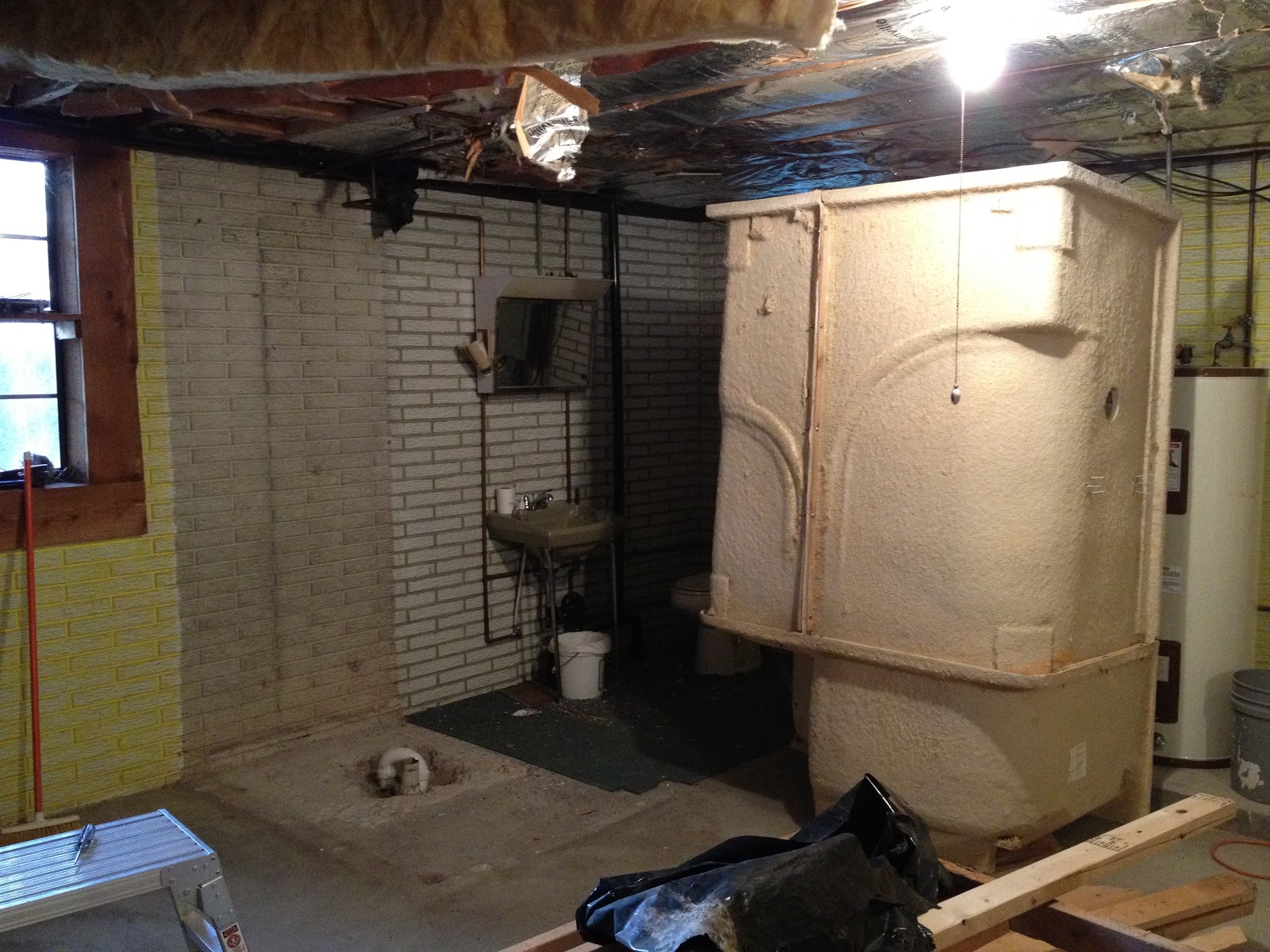 So here’s what we’re working on now. Today we tore out the 3/4 bath that was in the basement. When we were working on the new floor plan, Kade decided it would be much more usable in the middle of the basement…and I would have to agree. He figured we’d already gone this far…so why not 🙂