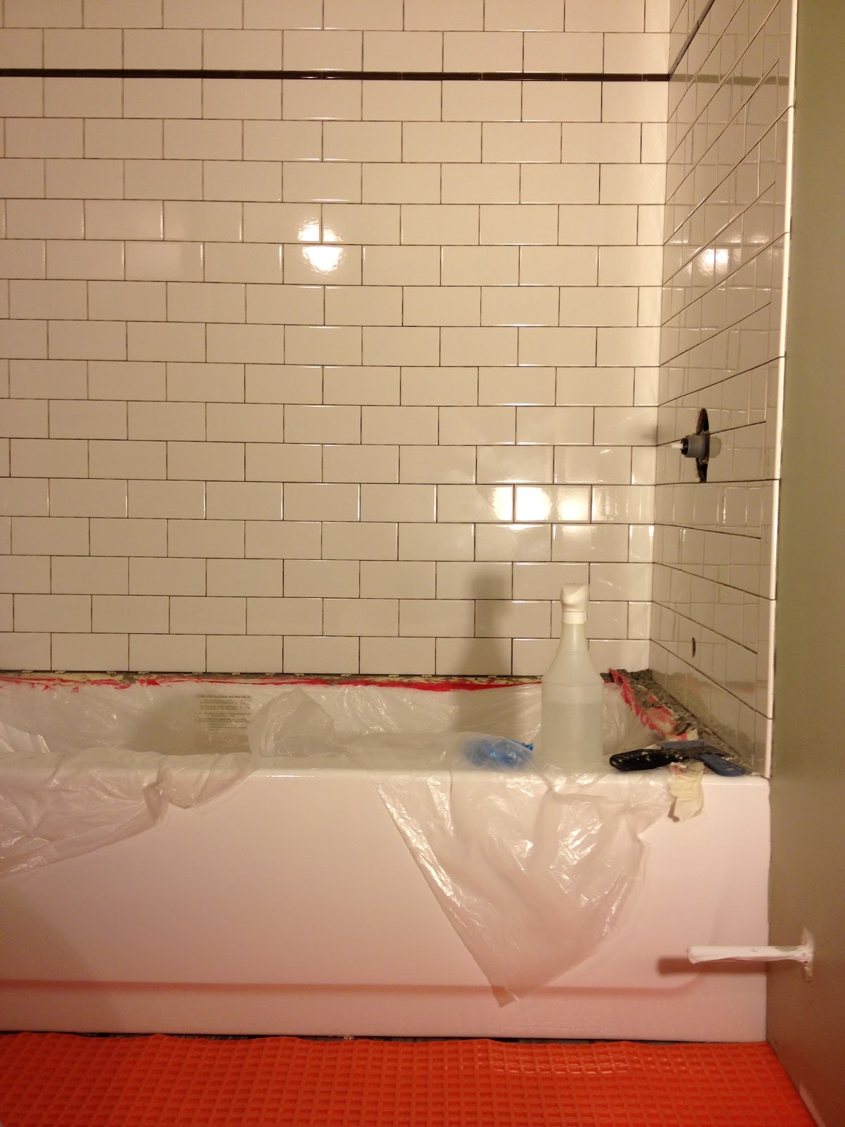 Tonight we didn’t get much done (seems we have a lot of evenings like that!) We did get the Ditra cut for the bathroom floor though. Tomorrow night we’ll get that put down. This stuff is so weird. It’s a tile underlayment, you spread out mortar, push this down into it, then you tile right over the top…just like you’d normally lay the tile. Now I’m nervous about putting down the floor tile, lol.