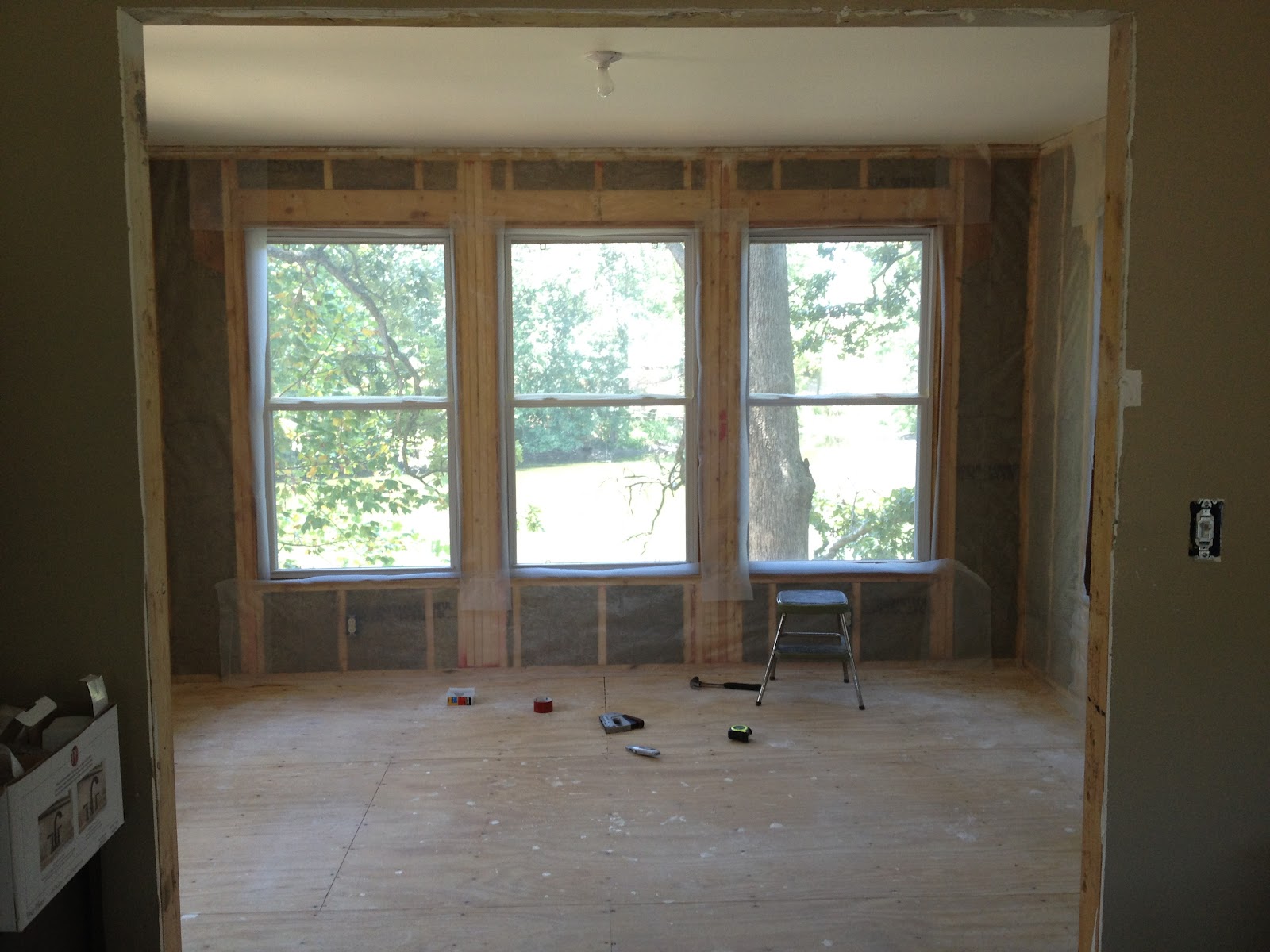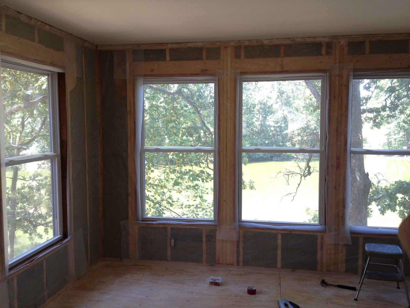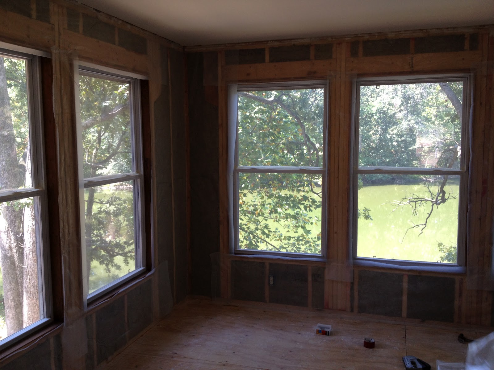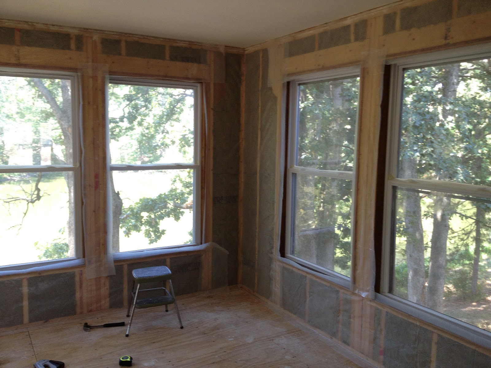 Oh, I’ve so been waiting for this part! I HATED the wood paneling in the sunroom 🙂 Dad removed the wood paneling last night while we went to Lowes & Home Depot…only to find out that it had drywall underneath it…and it was NOT a good drywall job, lol. Sooo…had to tear that out too. We got it all cleaned up though and Dad and I got started on the tongue & groove. I am soooo excited about this room! Since we had it all opened up we decided to go ahead and replace the insulation…we used the Roxul again…man I just love that stuff…so nice! Then we put a vapor barrier up since it is technically an exterior wall.