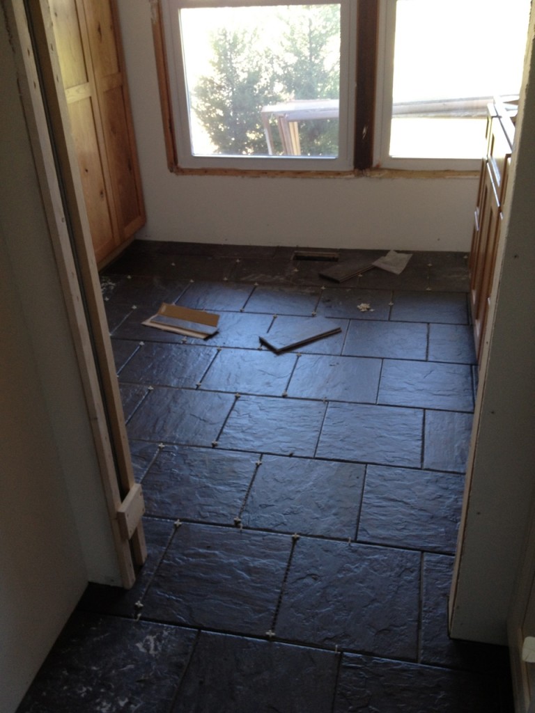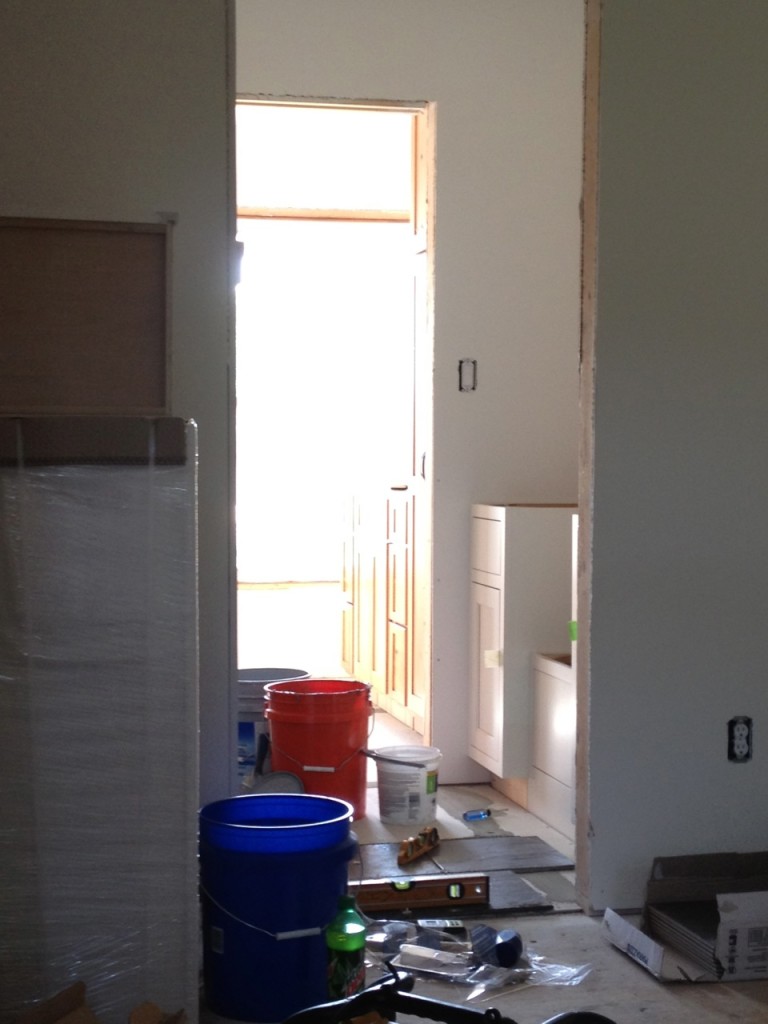 Tiling mess! See those cabinets on the right…those are the mudroom cabinets.
