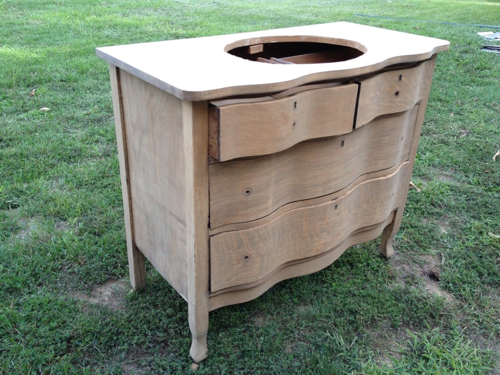Here’s the dresser that I’m using for the main bathroom vanity. I worked on sanding it today while the tile guy was here.