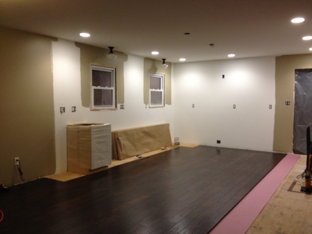 And we are ready for tomorrow in terms of the flooring.  It blows my mind how long it takes us.  It must be because of the “rustic” and “solid” aspect of it.  You can’t just slide it into place and nail.  I sit there and tap it in (ok, sometimes I have to hammer it REALLY hard) to get it into place.  Then Kade stays standing and he does all of the nailing.  I must admit.  I’m picky about which boards go where also.  I really do inspect every board, lol.  Now….we’ve got to get to bed…morning will be here before we know it.