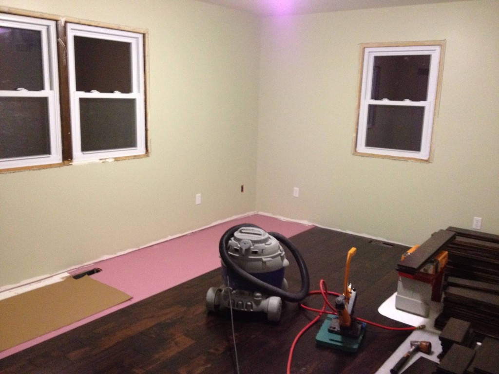 I never thought it would be so hard to do EVERY job in this house…and lots of them all at the same time, lol. HELLO! I’m not exactly sure how I thought this was going to go. We’ve gotten quite a bit farther on the flooring. Just about done with the front bedroom now. I think only 9 rows left to go! This is the LAST actual room. Then it’s finish the closets and finish all of those darn cut edge pieces.