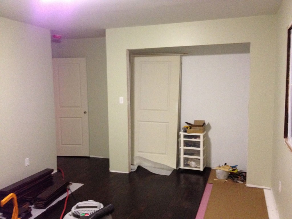 Can you believe…the double closet doors in the bedroom (pictured a few weeks ago) are now two individual doors. UGH! We didn’t have them screwed in and they fell out of the opening and hit a storage shelf that we had in that bedroom. Thankfully this was before the flooring went in! We’re going to try and order a new piece of split jamb and hopefully we’ll be able to fix them. Just one more little thing that’s going to take an extra day or two to fix.
