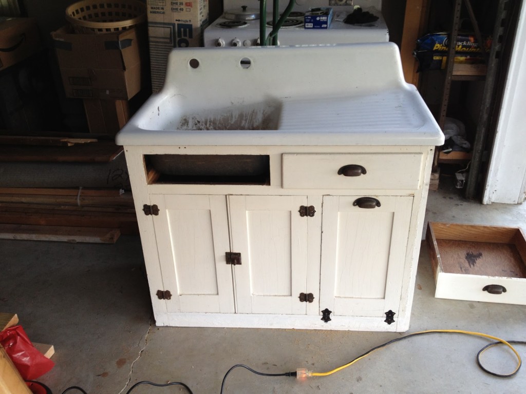 Here’s that old wooden kitchen cabinet paired with the cast iron sink that was given to us. I LOVE the way this is going to turn out! Since this photo I have since stripped off the old white paint…and about 4 other colors beneath it! I’m waiting until it’s ready to go into place before I actually give it its final finish. I also need to cut down the left drawer so it can be permanently fixed into place. That door on the bottom right is actually a potato bin…thinking that may be super awesome for the trash can! We’re just about ready to start working on this bathroom now (just need the drywall primed & painted) So this vanity should be getting finished soon! YEAH!