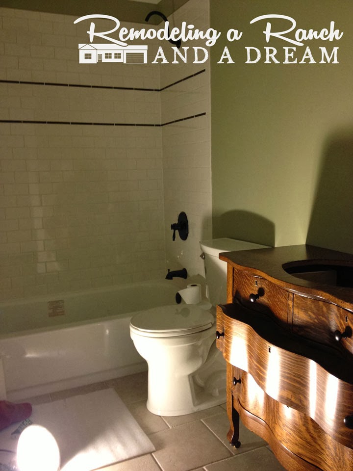 This is the most recent picture that I have of that bathroom…not sure why I don’t have one of it done. (I’ll get right on that!) Notice the mirror hanging above the sink….that’s from that fabulous dresser that I bought. It was too short to leave attached to the dresser…and I felt in a main bathroom it was too small of a mirror overall…but I think it works perfectly here! Those schoolhouse style lights “hug” it in just the right place!