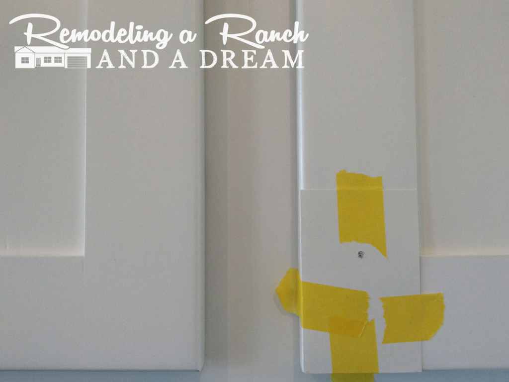 Knob placement is always something that I take very seriously, lol.  It is soooo annoying to me when a knob or pull is off center….even just a little.  Today I made a little template out of poster board and used the Frog tape for delicate surfaces to make the marks for my knob placement.