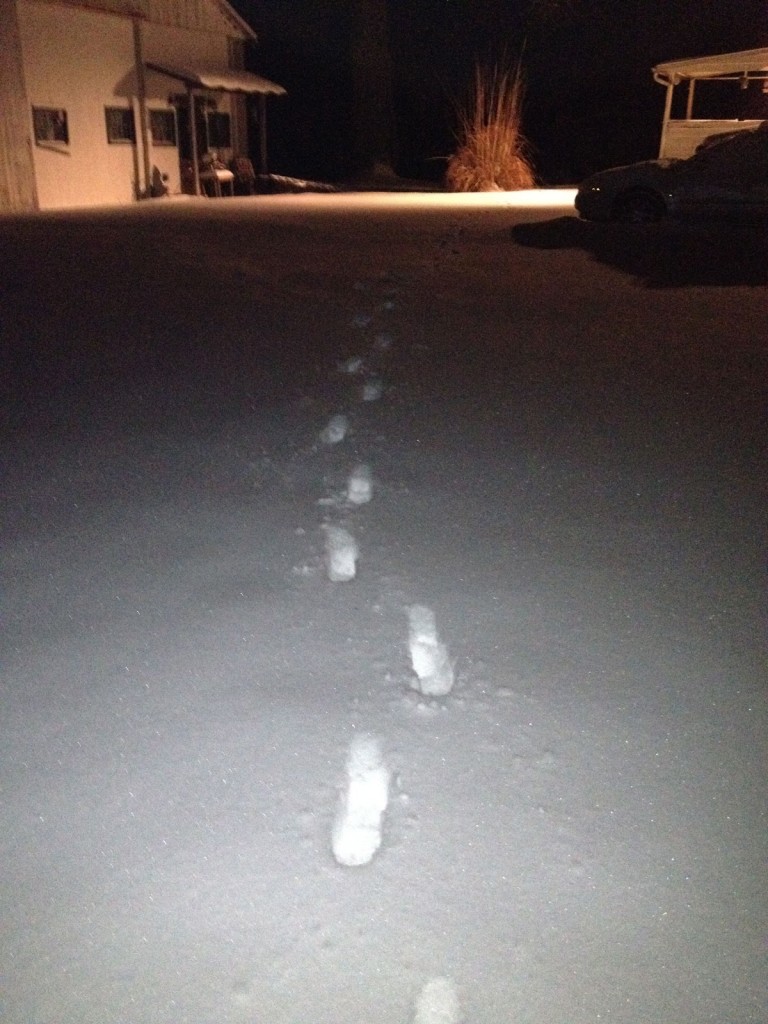That’s right, you read that correctly…WE’RE TAKING A SNOW DAY!!  🙂  It started snowing right around noon today and hasn’t stopped yet! (Kade even got out of work at noon…and they NEVER do that!)  We’ve probably got 4 or 5 inches so far!  It’s been a few years since we’ve had this much snow at one time.  We walked over to my parents for dinner tonight and all I could find to wear were my rain boots, lol.  That’s one way to keep my feet from getting wet…but it SURE didn’t keep them warm!  WHOA BABY!