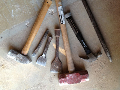 Here’s all of the tools that it took to get it out.  I probably could have left out my hammer…I’m pretty sure I only swung that one or two times…it was useless.  It was mostly the medium chisel and the 5lb. maul that got the job done!  Oh…and some elbow grease!