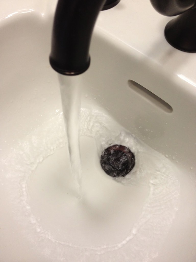 We are going to have to switch the drain though…it’s a pull up now, and we’ve got to put in a pop-up. There’s just not enough room behind this old sink for the pull up mechanism on the current drain.