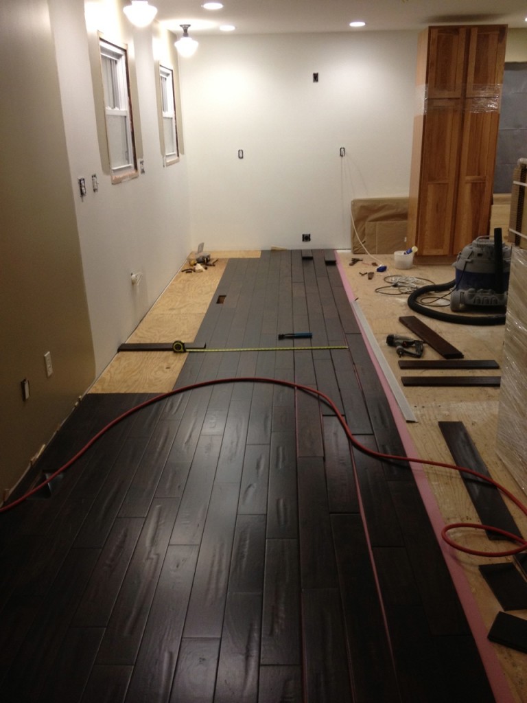 ANYWAY – we used a piece of plywood to put down where the cabinets will actually sit. That gave us a good base to install the floor against – didn’t have to worry about our rows pushing back (unless we didn’t install the plywood straight, ha)