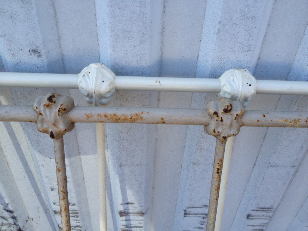 I have GOT to figure out what we’re going to be doing for a railing like NOW!!! I just keep putting it off and then putting it off some more 🙂 So what I’m thinking is that we’re going to use parts from two old iron baby cribs. They would be the long side rails. If we could just somehow frame them in to the railing….hmmm….going to have to really sit and think about it a bit.