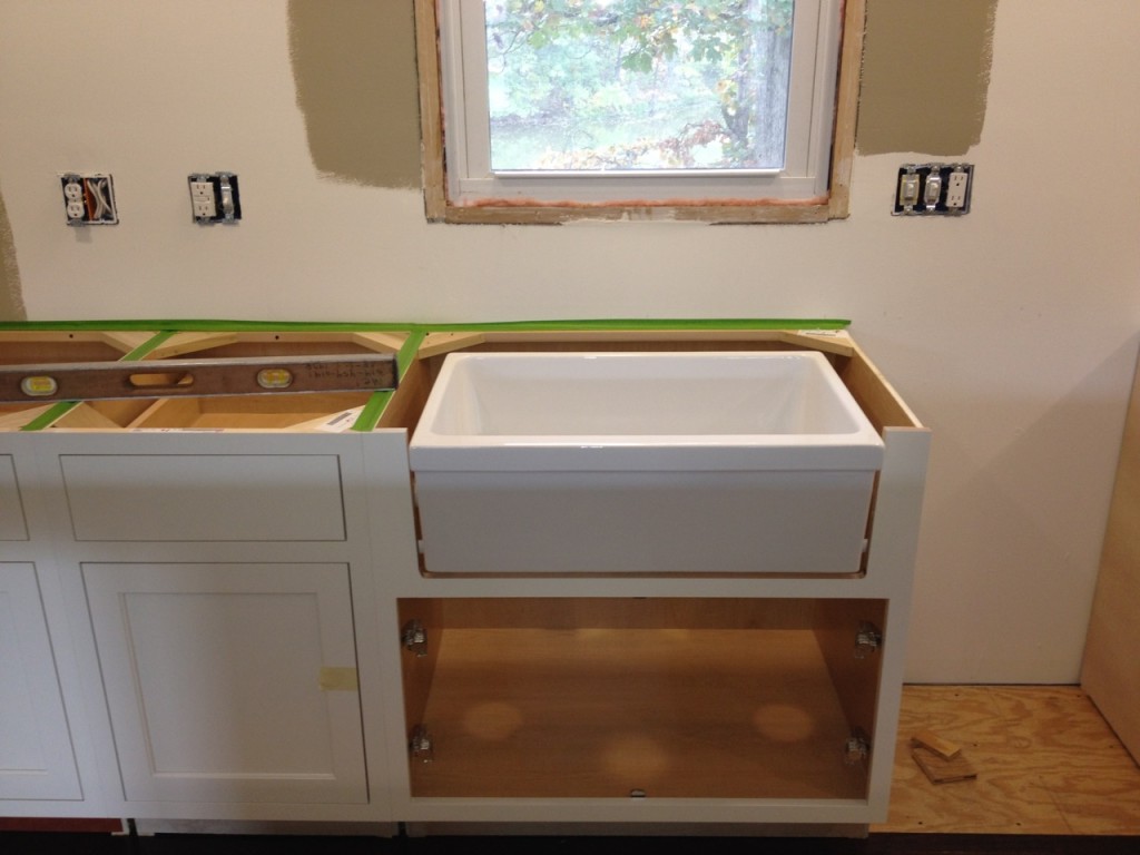 After our modification of the farmhouse sink cabinet, we were left with a hole that was cut about 1/2″ too wide on all sides.  We figured we could come up with something to “trim” it out.