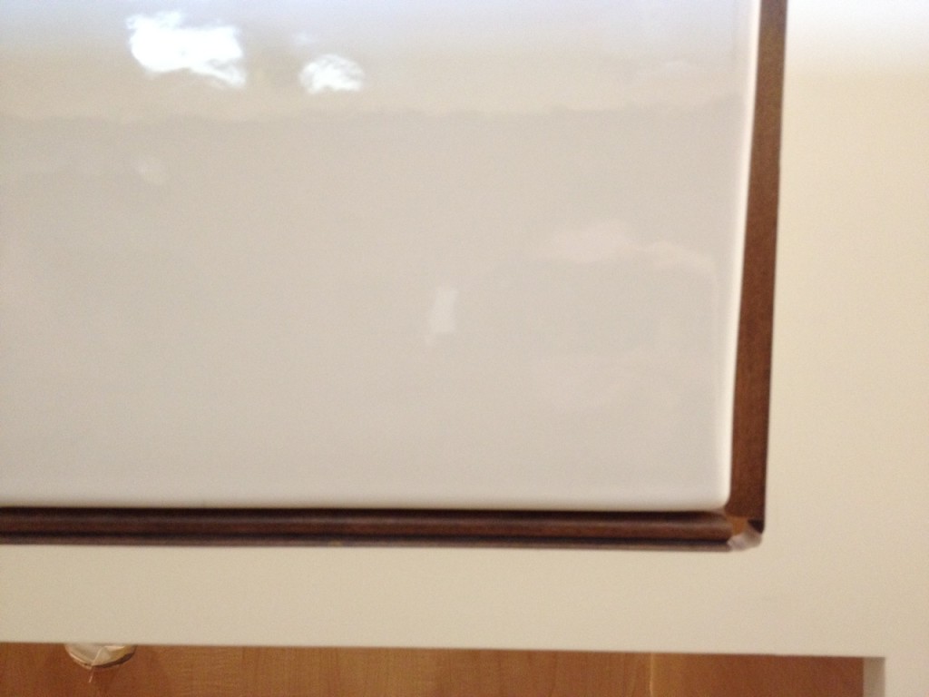 Here is the FINAL final decision on trim 🙂  We cut off the top of the furniture moulding, so it included a bead type edge – and then it kind of “hugs” the sink.  This also got us the glaze color that we have on the island as well.  Now it looks like we actually did it on purpose!