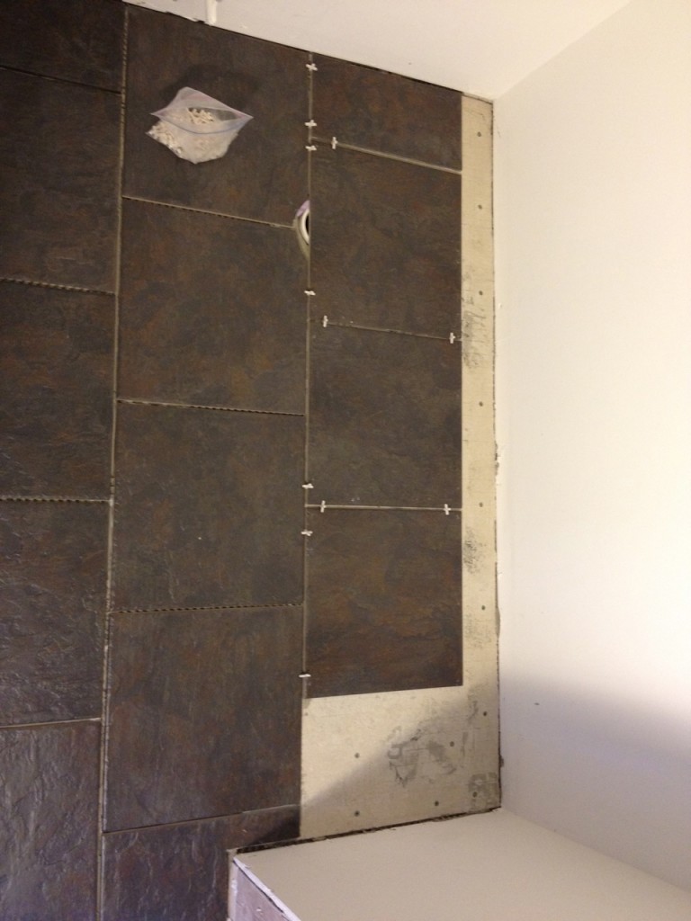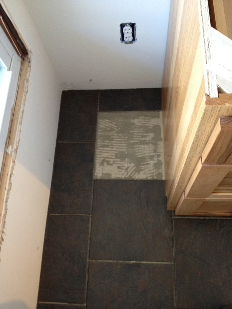 Does anybody know what movie that is from? It’s from the 90’s…and I LOVE it, lol. So yesterday we got to walk on the tile job – and I got to really see what kind of job was done….and I’m not going to say that I love it. In fact…here is the end result after 24hrs. of contemplating…