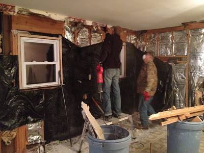 From my “station” in the front room I kept hearing an awful noise…I got up…slid the pocket door open and peeked in at Dad & Kade….there they were ripping up the extra layer of subfloor in the kitchen. Oh my gosh if you could have seen all the nails! Look how big Dad’s pry bar is – the think is like 4′. That’s the persuader of pry bars!! They were both sweating like dogs when they were doing this! (and the temp is only 50 in the house…so you know they were working hard!!)